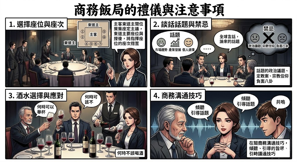 A:商務飯局的禮儀包括適當的座位安排、談話話題選擇、酒水的應對以及桌上的禮儀行為。談吐應尊重對方,避免過於輕佻或競爭性強的言論。